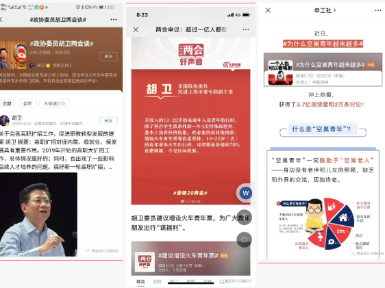 2020年,胡卫委员提交的“关于增设火车青年票等优惠票种的提案”成为了当年全国两会的热门话题之一。在提案中,胡卫建议修改儿童半价票为未成年人半价票,不再以身高为标准,并增设火车青年票。这则建议获得了高达2.7亿次的阅读量。
