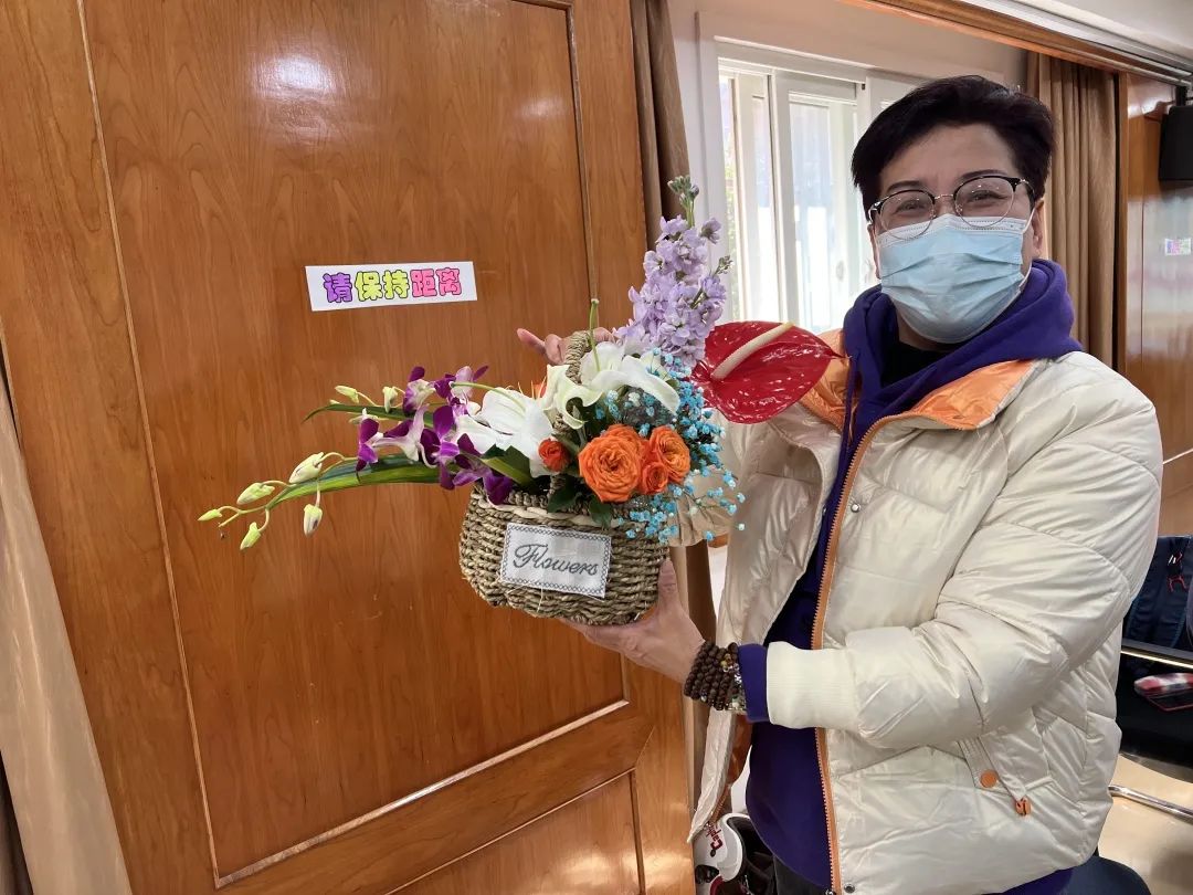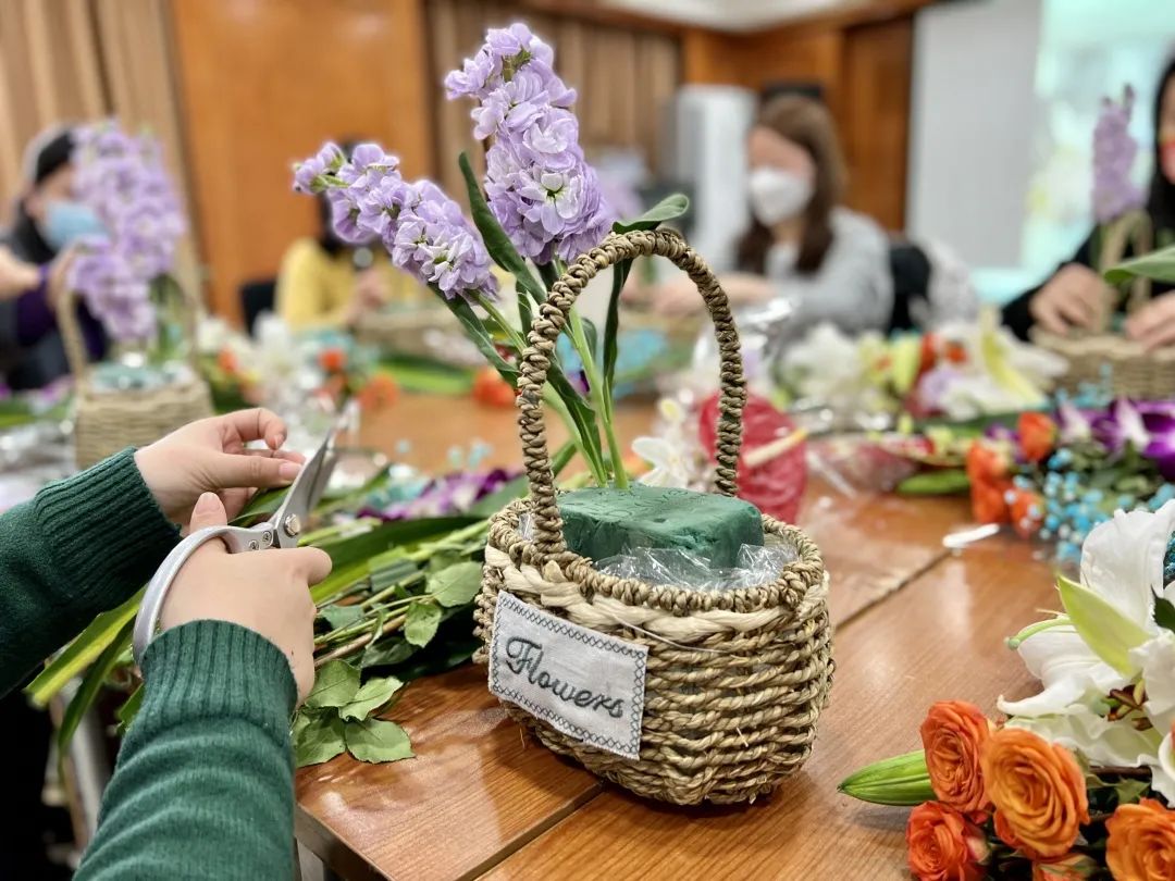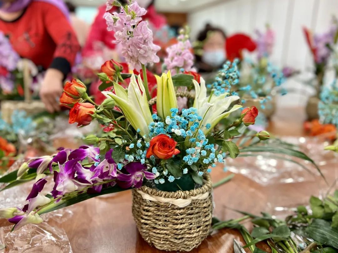 随后,工作人员将一束束鲜花送到大家手中。不仅有大家熟悉的白百合,还有一些叫不上名字的鲜花,虽不常见,但颜色却有红有紫、鲜艳喜人。阿姨们通过设计、修剪、装饰等,一步步把原本普通的花草变成专属于自己的插花“艺术品”。