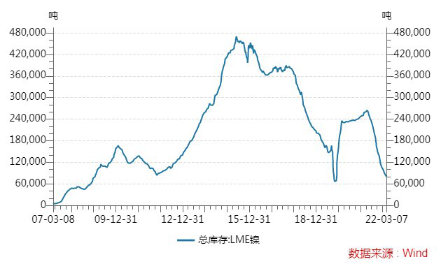 期货交易所的低库存也加剧了镍价的飙升。数据显示,3月7日,LME镍库存仅为7.68万吨。自去年4月以来,已经下降近70%,创下2008年以来新低。截至北京时间3月8日17时,伦敦金属交易所(LME)铝库存减少7125吨,铜库存减少650吨,镍库存减少1818吨,铅库存减少1925吨,锡库存持平,锌库存减少275吨。