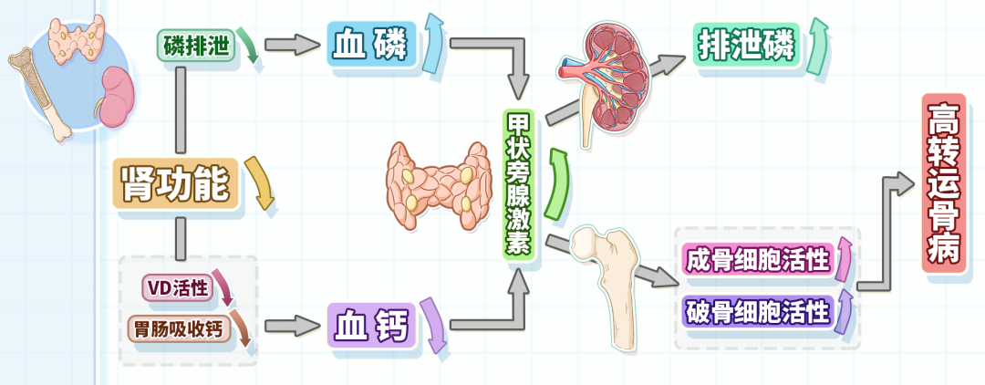 肾功能减弱时,会出现血磷升高、血钙降低的情况,这会激发甲状旁腺激素进行调节,但这个激素同时还有调节成骨细胞和破骨细胞活性的作用,如果调节力度过大就可能导致骨病。