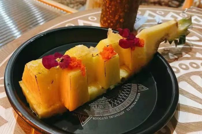 除了好吃的烧烤,店里比较特色的一道菜就是“蜂巢鱼籽酱凤梨烤”,这道菜的配搭还是特别新奇,菠萝外面包裹一层糖汁,碳焦的香味,配合鱼子酱,一口下去鲜香酸甜,非常开胃。