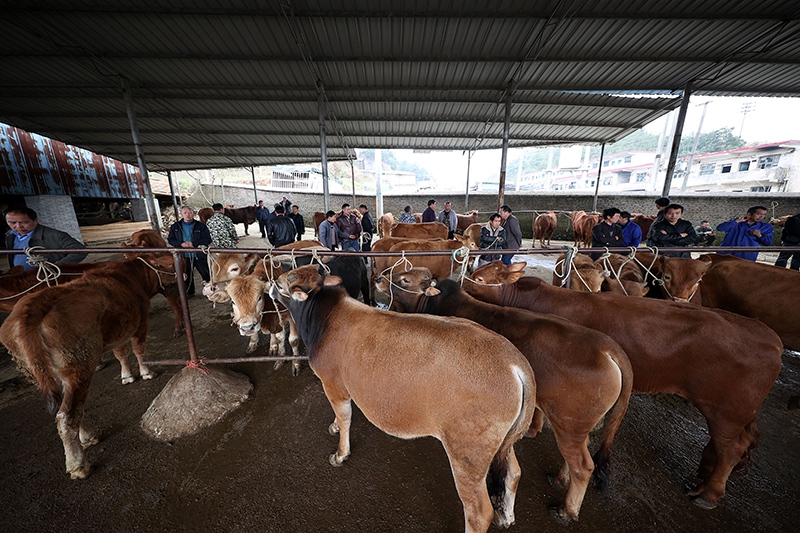 3月10日,人们在贵州省黔东南苗族侗族自治州丹寨县龙泉镇集市上选购耕牛。大地回春,又是春忙时节。无论在田间地头,还是乡镇市集,各种充满乡土气息的集市热闹了起来,卖种苗、卖农具、卖鸡苗……四面八方的人们前来赶集,带来满满的人间烟火气。新华社发(黄晓海 摄)