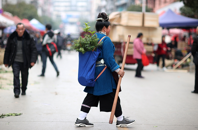 3月10日,在贵州省黔东南苗族侗族自治州丹寨县龙泉镇集市上,一名苗族妇女背着购买的树苗赶集。新华社发(黄晓海 摄)
