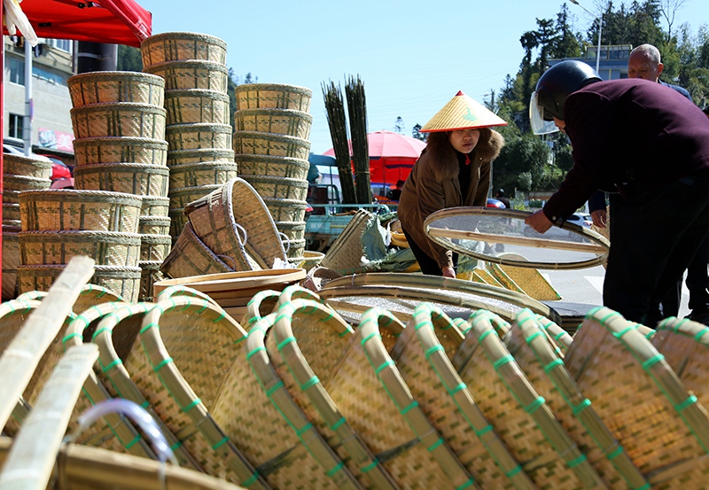 3月8日,在福建武夷山传统集市“柴头会”上,人们在挑选竹制品。新华社发(陈颖 摄)