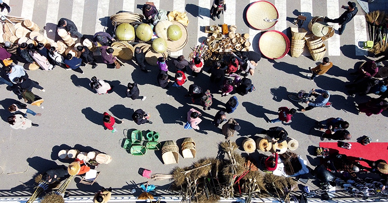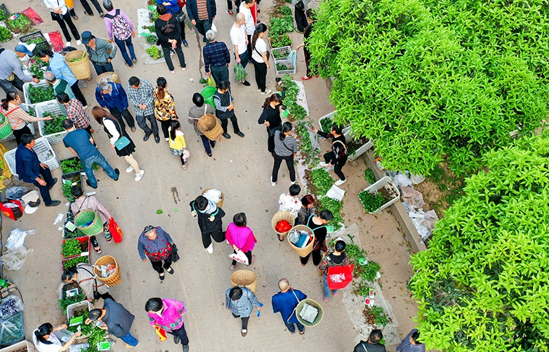 3月13日,在四川省泸州市江阳区分水岭镇农资市场,人们在采购蔬菜秧苗(无人机照片)。新华社发(刘学懿 摄)
