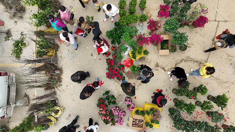 3月12日,人们在贵州省锦屏县三江镇集市上选购苗木(无人机照片)。新华社发(杨晓海 摄)