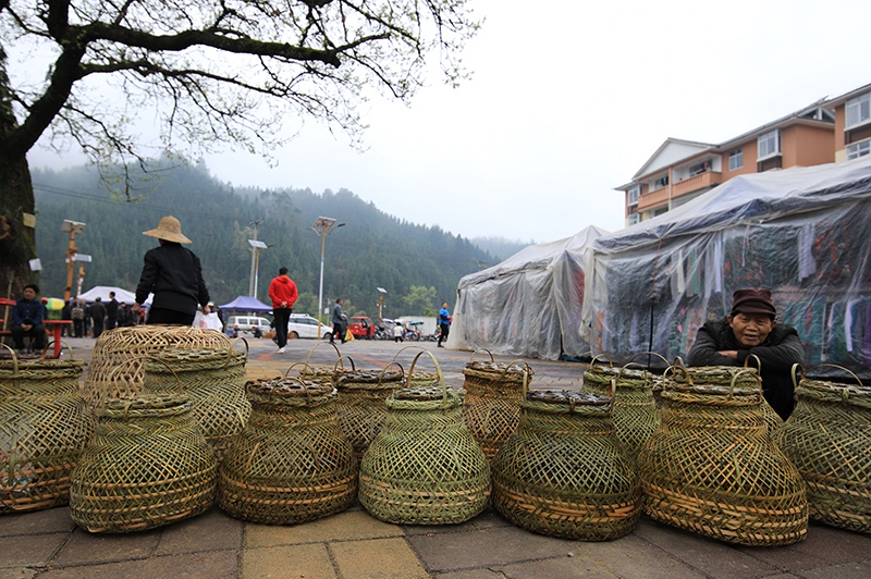 3月13日,村民在贵州省从江县刚边乡集市上售卖自编的竹制品。新华社发(罗京来 摄)