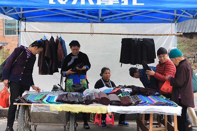 3月13日,人们在贵州省从江县刚边乡集市上选购布料。新华社发(罗京来 摄)