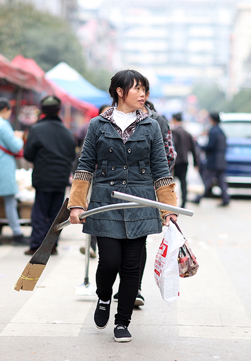 3月10日,在贵州省黔东南苗族侗族自治州丹寨县龙泉镇集市上,群众拿着购买的传统农具赶集。新华社发(黄晓海 摄)