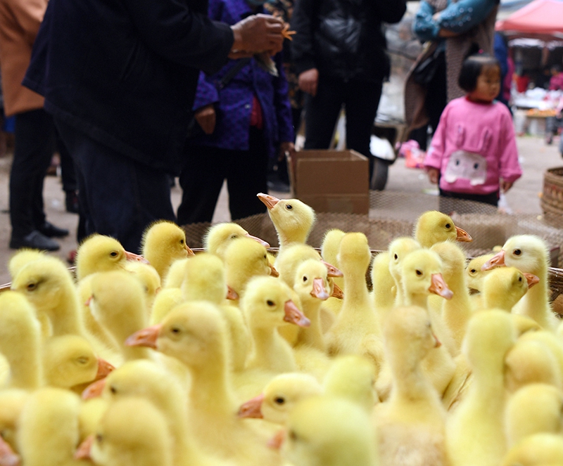 3月12日,人们在贵州省锦屏县三江镇集市上选购禽苗。新华社发(杨晓海 摄)
