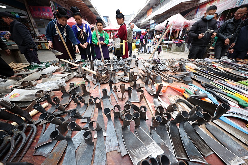 3月10日,人们在贵州省黔东南苗族侗族自治州丹寨县龙泉镇集市上选购农具。新华社发(黄晓海 摄)