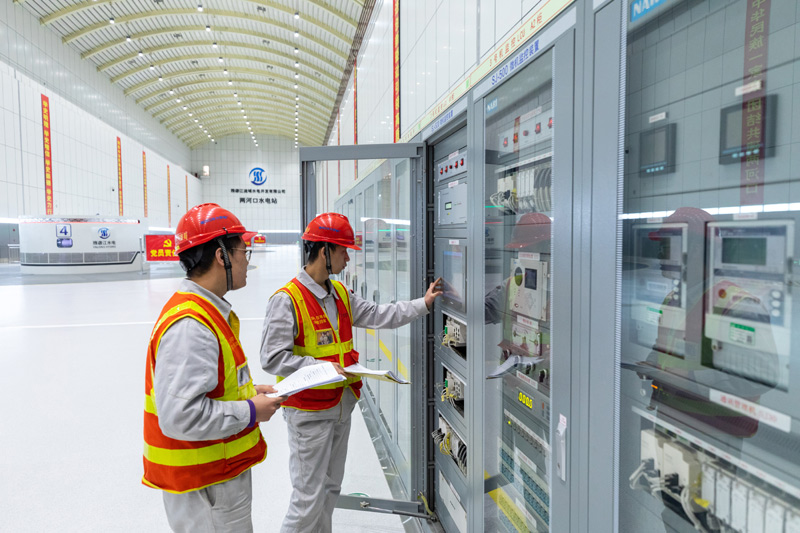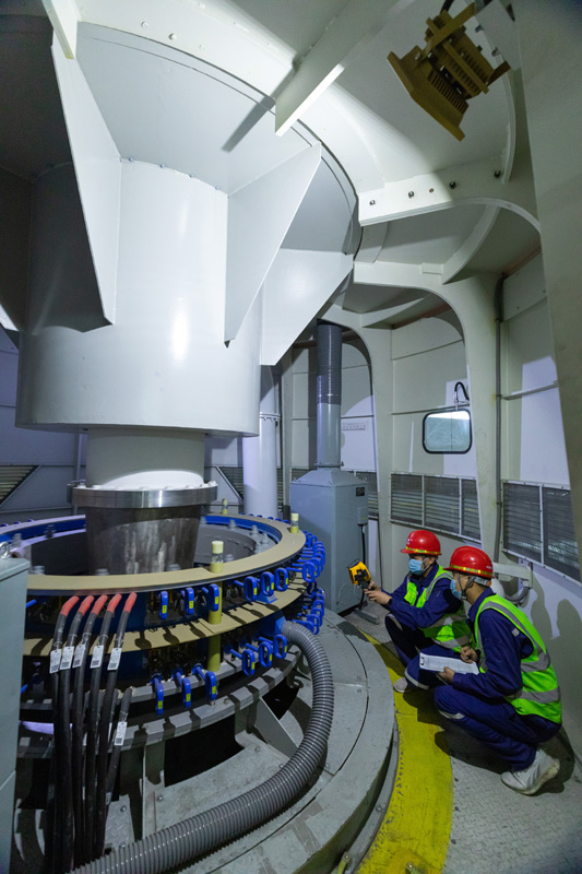 3月17日,在雅砻江两河口水电站发电机层,检修部员工进行监控设备巡检。新华社记者 沈伯韩 摄