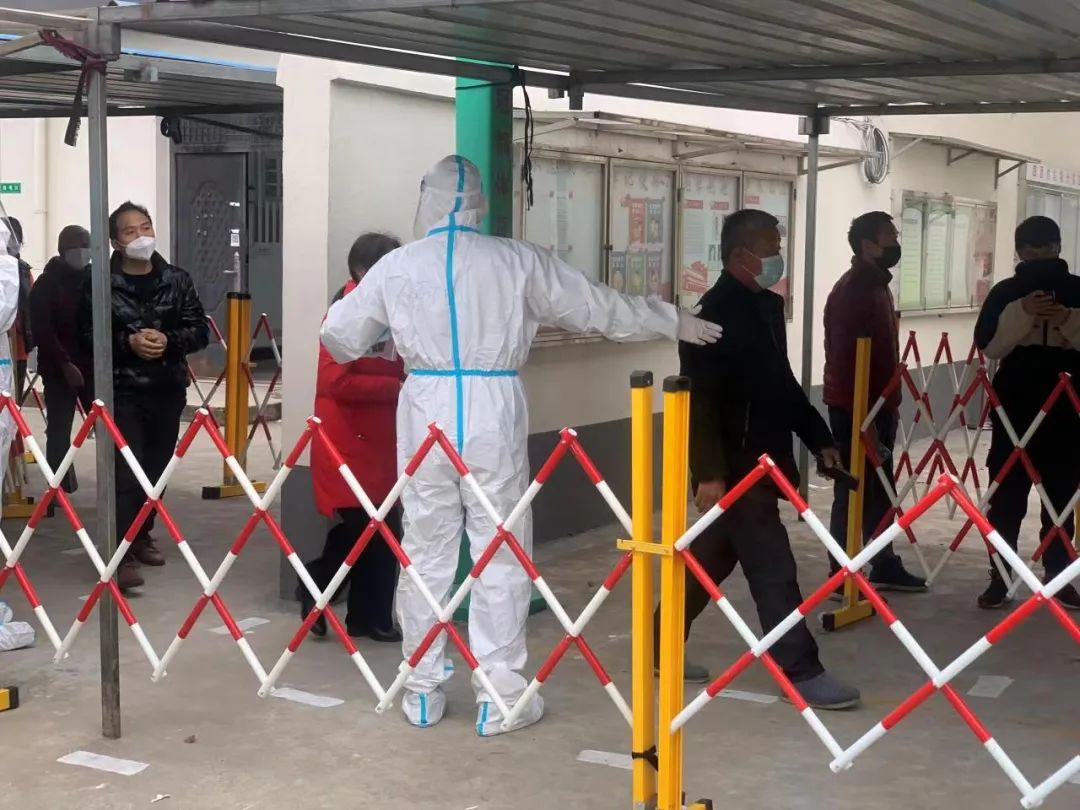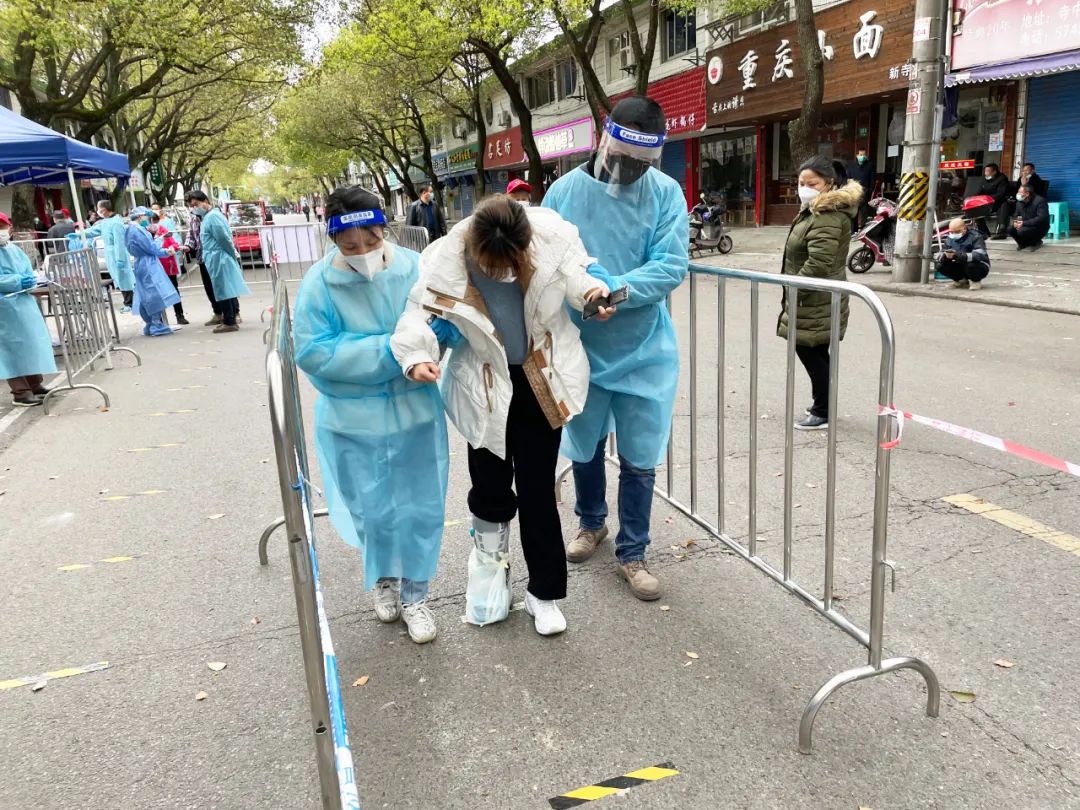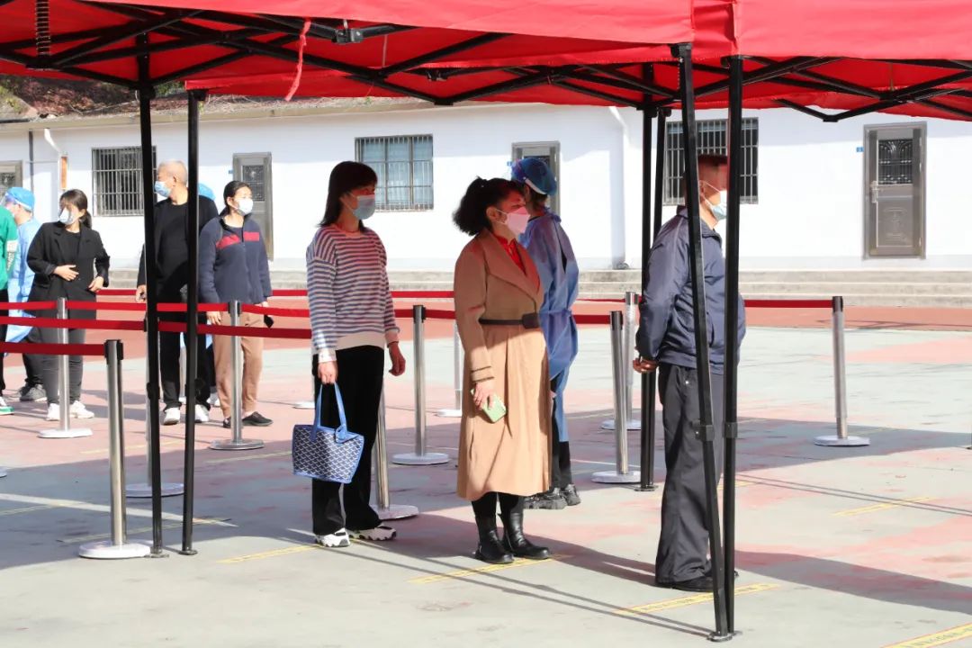 青村镇居民在志愿者引导下有序开展核酸检测。