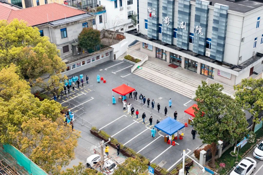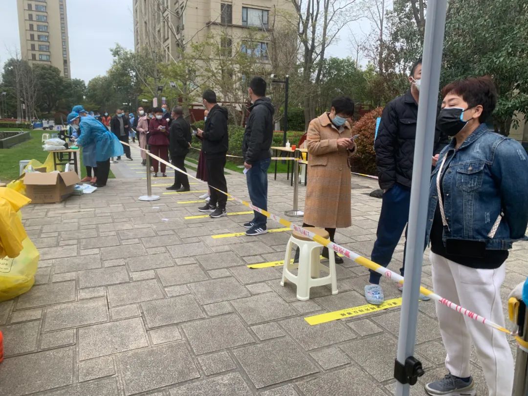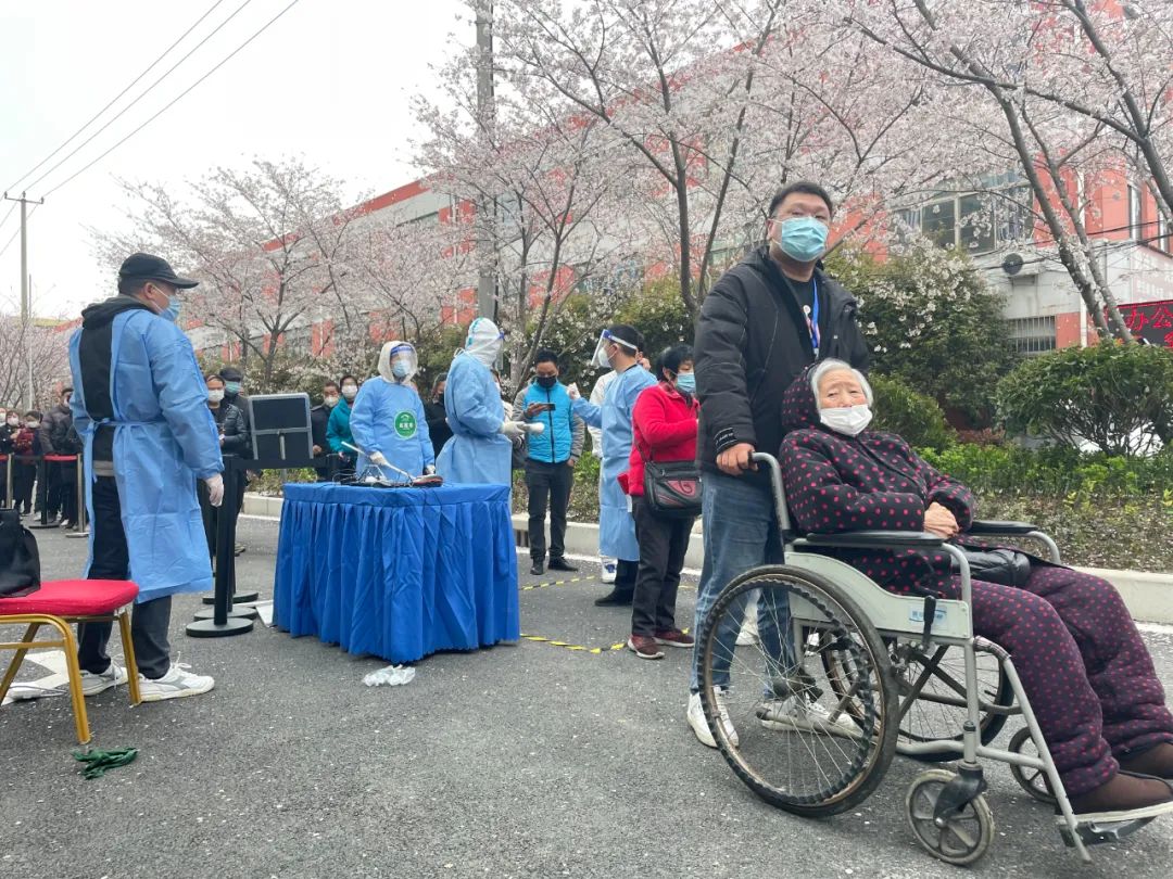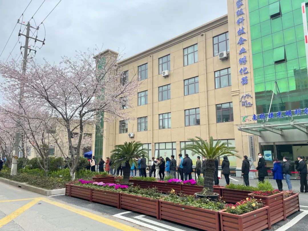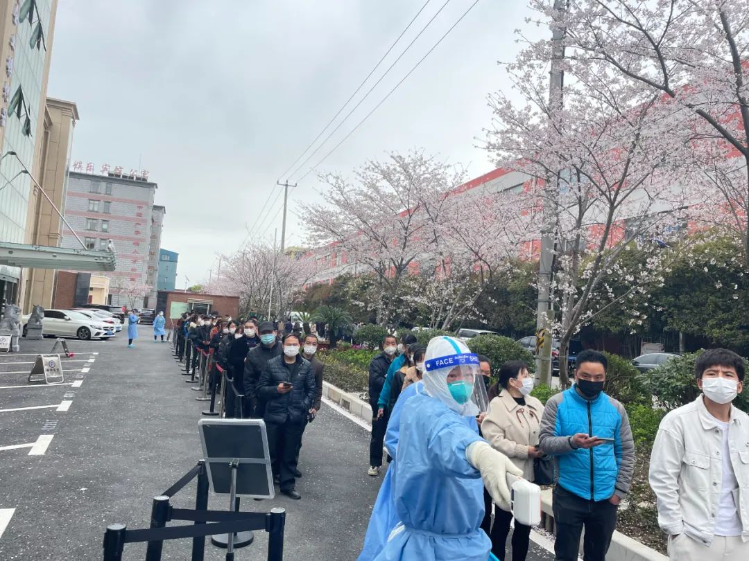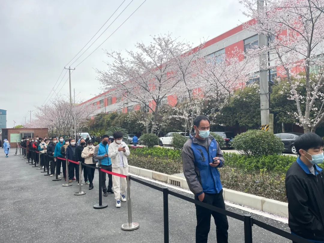 疫情关不住春色,南桥镇光明园区企业职工在樱花树下排队做核酸。