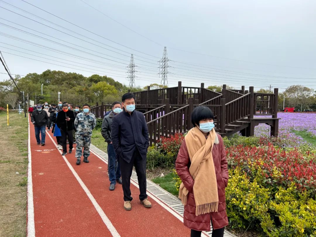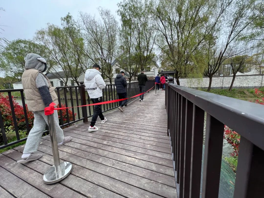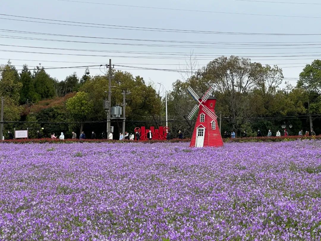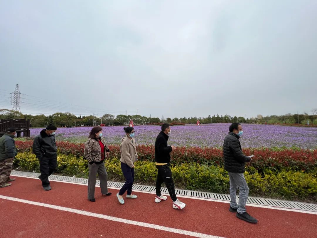 金汇镇明星村检测点,村民们漫步在小桥流水和紫云英花海中有序等待核酸检测。