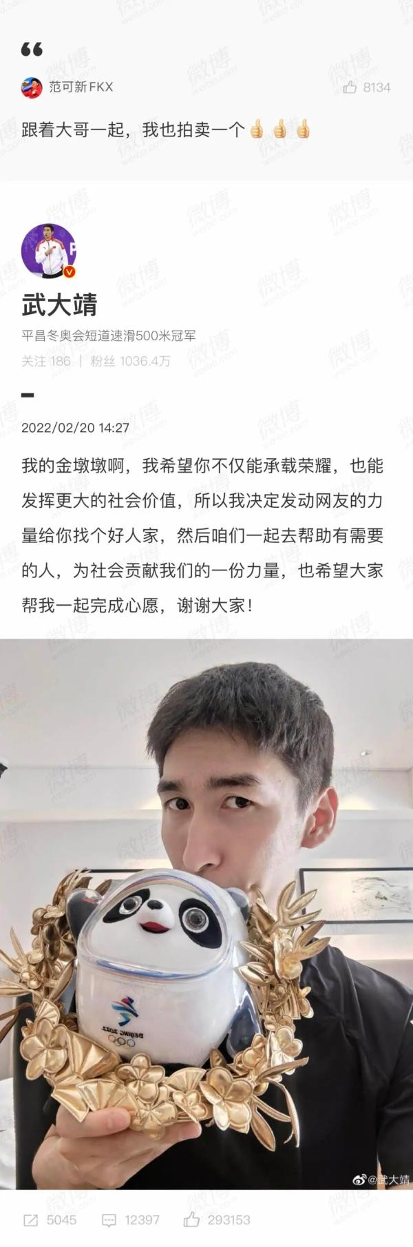 冬奥会冠军武大靖把自己获得的金墩墩拿出来拍卖,