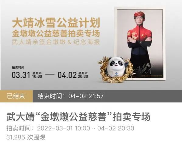 3月29日," 大靖冰雪公益计划 金墩墩公益慈善拍卖专场 "正式启动,拍卖个人获得的北京冬奥会奖牌选手专属吉祥物金墩墩,以及8幅限量版亲笔签名海报。