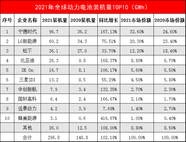 韩国市场研究机构SNE Research发布的2021年全球动力电池装机量排行榜显示,2021年全球动力电池装机量前十名分别为:宁德时代、LG新能源、松下、比亚迪、SK On、三星SDI、中创新航(中航锂电)、国轩高科、远景动力、蜂巢能源。