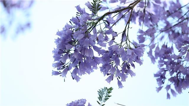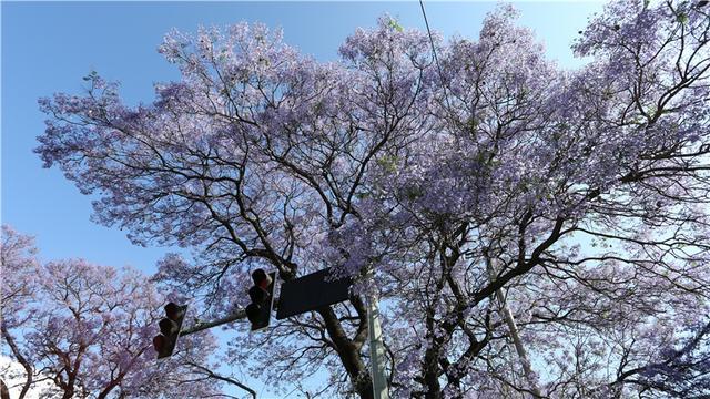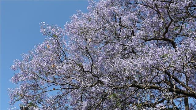 蓝花楹来自南美洲,中文名字翻译的“楹”,非常妙,一来音韵和谐,二来也极为贴切,《说文解字注》中记载,楹、亭也。亭亭然孤立、旁无所依也。“亭亭如盖”正是这一街蓝花楹的完美写照。