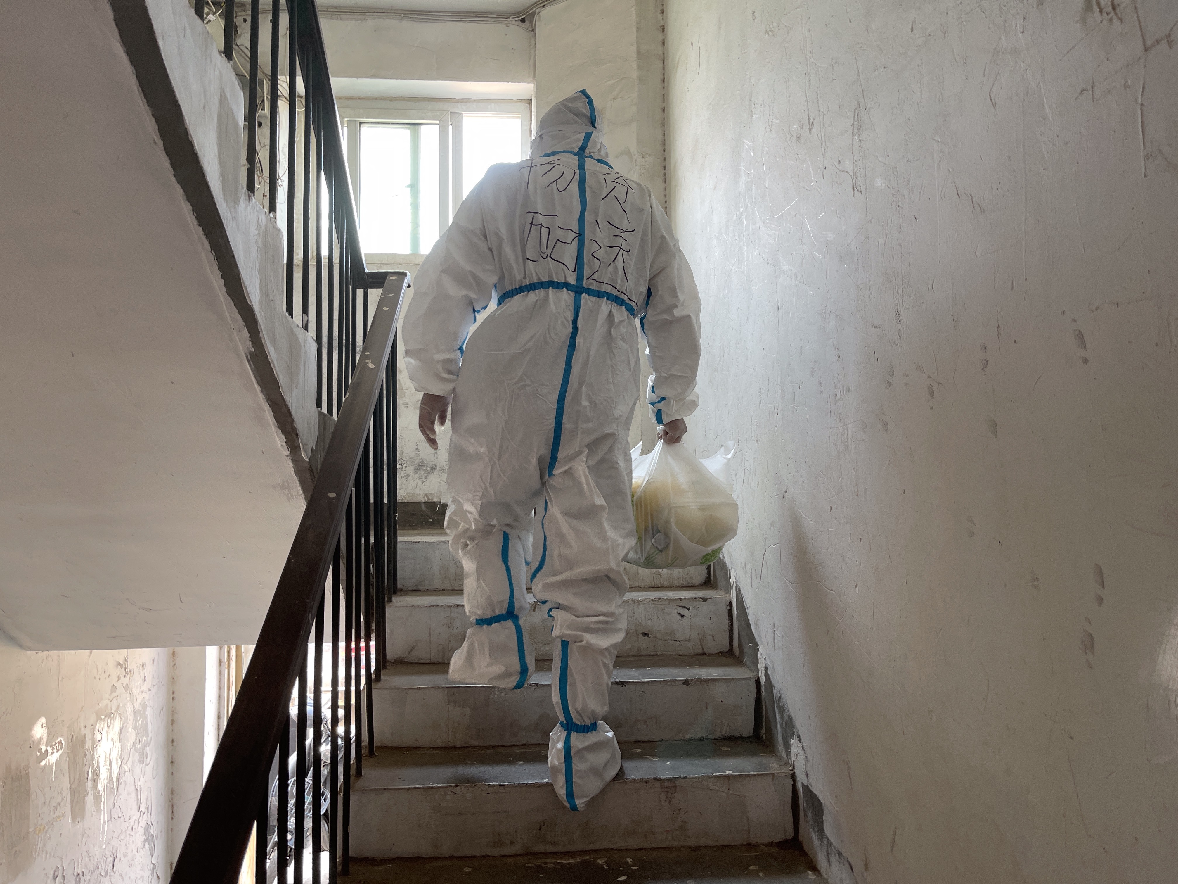 和日常工作不同,身穿肥大且不透气的防护服送物资,并不轻松。拎着物资跑完一栋楼,黄俊琨就已经汗流浃背。“我这才知道,平时看到的那些‘大白’,都跟我一样捂得可难受呢。”黄俊琨表示,尽管辛苦,但自己始终坚持。“每个人都出力了,我擅长送货嘛,也要做贡献。”在封控小区里,黄俊琨并不觉得自己是“外人”或者旁观者,作为新就业群体,自己不光是“打工人”,更是社区需要时,挺身而出的志愿者。平时,他总是送完快递就匆匆离开,而在5月2日当天,刚刚送完物资,就被一户居民叫住。“你们实在太辛苦了,这两箱水送给你,天气也挺热的,你们要把自己照顾好。”这让黄俊琨一下子觉得,原来自己在帮助别人的时候,也得到了居民的认可和帮助。