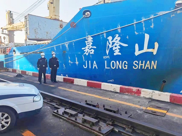 图说:外高桥边检站民警码头巡查,加强对“嘉隆山”轮在港期间的管理。外高桥边检站供图