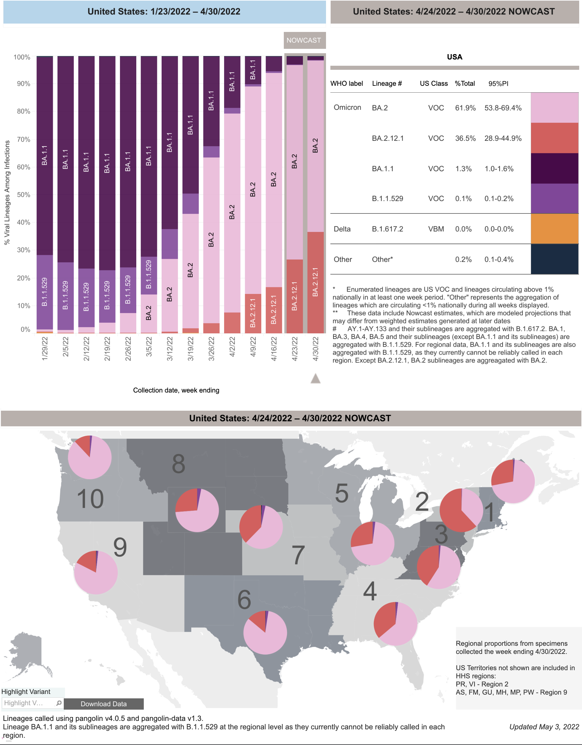 根据美国疾控中心CDC最新的监测数据,BA.2.12.1变异株已经占据了纽约州、新泽西州61.9%的比例。而在全美,BA.2.12.1变异株也已经占据了36.5%的比例,这较之前的28.2%大幅飙升了29.4%。