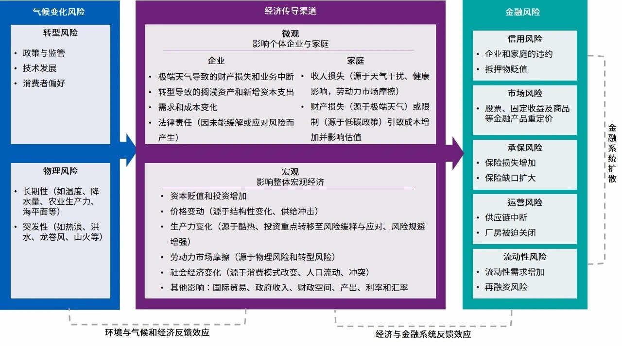 气候变化风险(以下简称气候风险)泛指气候变化所导致的风险和非气候领域的环境因素(如空气污染、水污染、土壤污染等)所导致的风险。气候风险可以按其来源分为两大类:物理风险和转型风险。物理风险的来源包括各种极端气候事件(如热带气旋)、海平面上升、生态环境污染事故、自然资源的破坏和短缺等。转型风险的来源主要是政策、技术、观念等为了应对气候变化和环境挑战的人为因素而发生的转变。