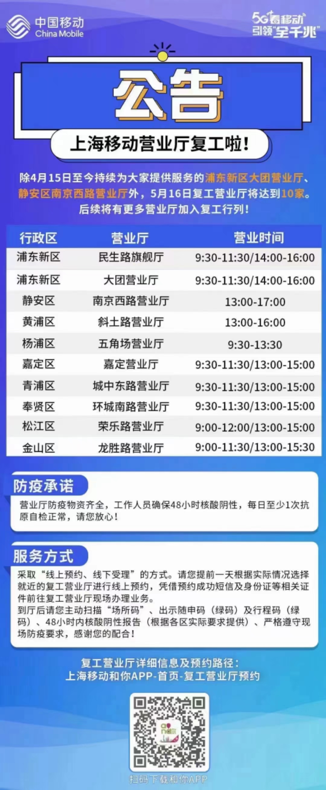 记者从上海移动获悉,根据上海市复工复产“有序放开、有限流动、有效管控、分类管理”原则,上海移动旗下首批10家营业厅已于今天起恢复线下营业。上海移动表示,此次复工营业厅采取线上预约、线下受理的方式。用户可根据实际情况选择就近复工营业厅进行预约,预约成功后会收到10658487下发的预约成功短信,届时凭借预约短信、带好身份证等相关证件前往复工营业厅现场办理业务。用户也可以拨打营业厅联系电话或10086咨询。记者获悉,随着疫情防控形势逐步好转,后续将有更多营业厅加入复工行列。