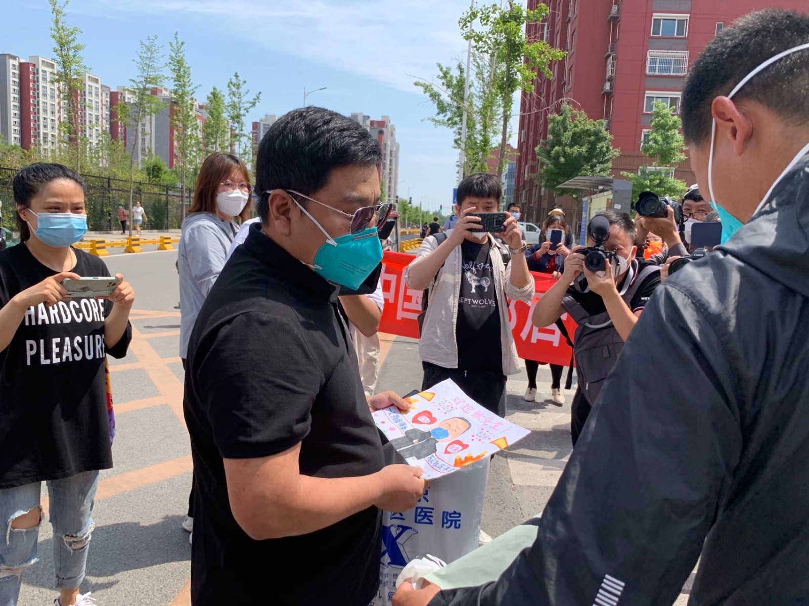 社区居民准备了横幅、鲜花和手工艺品,社区的小学生写了书法,还有以他的事迹为题材创作的简笔画。