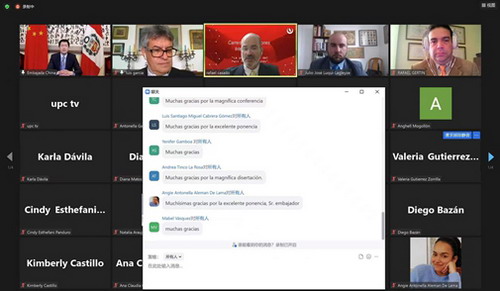 2022年5月17日,应秘鲁知名高校应用科学大学(UPC)邀请,驻秘鲁大使梁宇在该校线上平台举行“中国外交和中秘关系”专题讲座。该校领导、师生,秘专家学者等百余人在线实时聆听。讲座向公众开放,并被纳入该校国际关系专业课程。