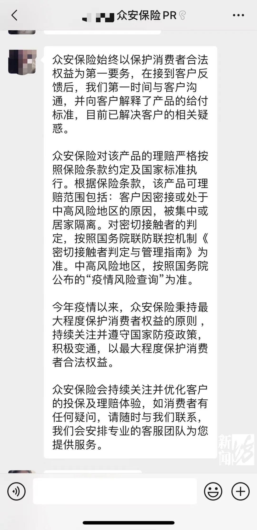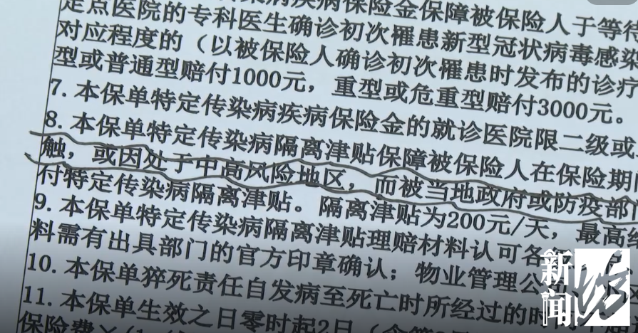 坊记查看了沈女士的保险合同,并电话联系了众安保险客服,客服人员还是咬定条文,沈女士这样非密接但居家隔离的被保险人,并不处于"中高风险地区"。