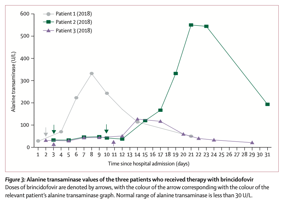 在治疗期间两种药物的选择无疑最令人关注。对此,研究者评价说,“在2018年英国诊断出第一批猴痘患者时,布林昔多福韦(brincidofovir)和特考韦瑞(tecovirimat)并没有获得任何许可用以治疗猴痘。布林昔多福韦之所以在2018年被选用,是医疗人员在紧急情况下对当地临床试验中已有供应品的再利用。鉴于涉及的人数很少,很难推断出布林昔多福韦治疗与病程之间的关系。虽然在几个样本中,猴痘病毒PCR循环阈值在病人服用药物后出现过短暂地降低,但这些情况的改善并不持久, 在患者之间也表现得不一致。我们并不知道在病程更早期给药或是采用不同的给药方案,是否会让布林昔多福韦(brincidofovir)产生更有益的临床结果。所有3名患者在用药后都出现了肝酶的紊乱,这直接导致了减少用药疗程的决定。但在已确诊猴痘感染的草原犬治疗中,布林昔多福韦(brincidofovir)具有适度的生存效益(29% vs 14%),并降低了终末器官的病毒滴度。”