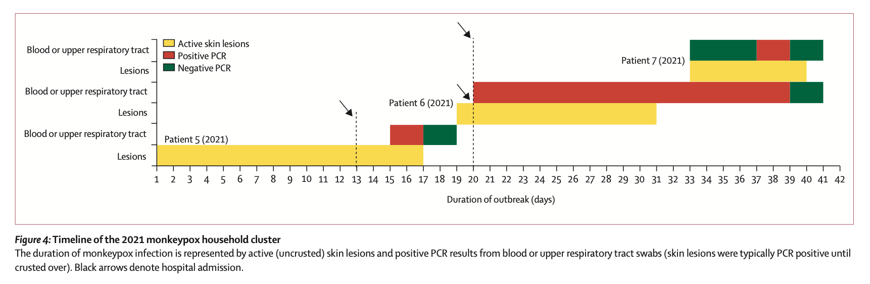 当最小的孩子随后出现发热和水疱疹后,全家都住进了同一HCID病房。三名较大的兄弟姐妹与当时被认为已经无传染性的父亲分在了一组,这三个儿童及其父亲在进行了血液和上呼吸道拭子取样、猴痘病毒PCR显示阴性后出院,在家中完成了21天的隔离。