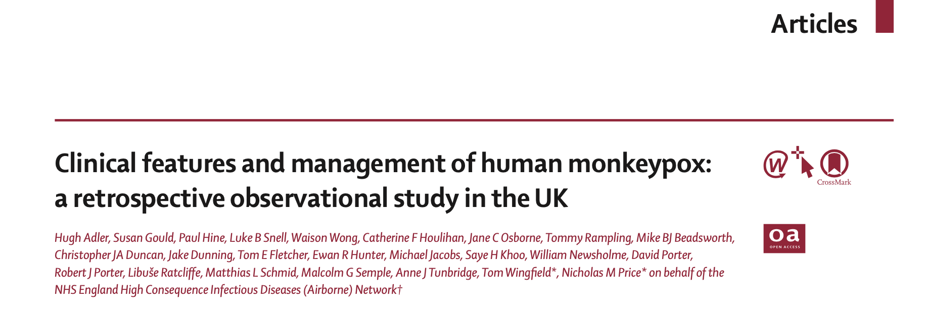 5月24日,国际权威学术期刊《柳叶刀传染病》以论文形式刊发了这项研究成果(英国猴痘病例的临床特征和疾病管理:一项回顾性观察研究,“Clinical features and management of human monkeypox: a retrospective observational study in the UK”)。