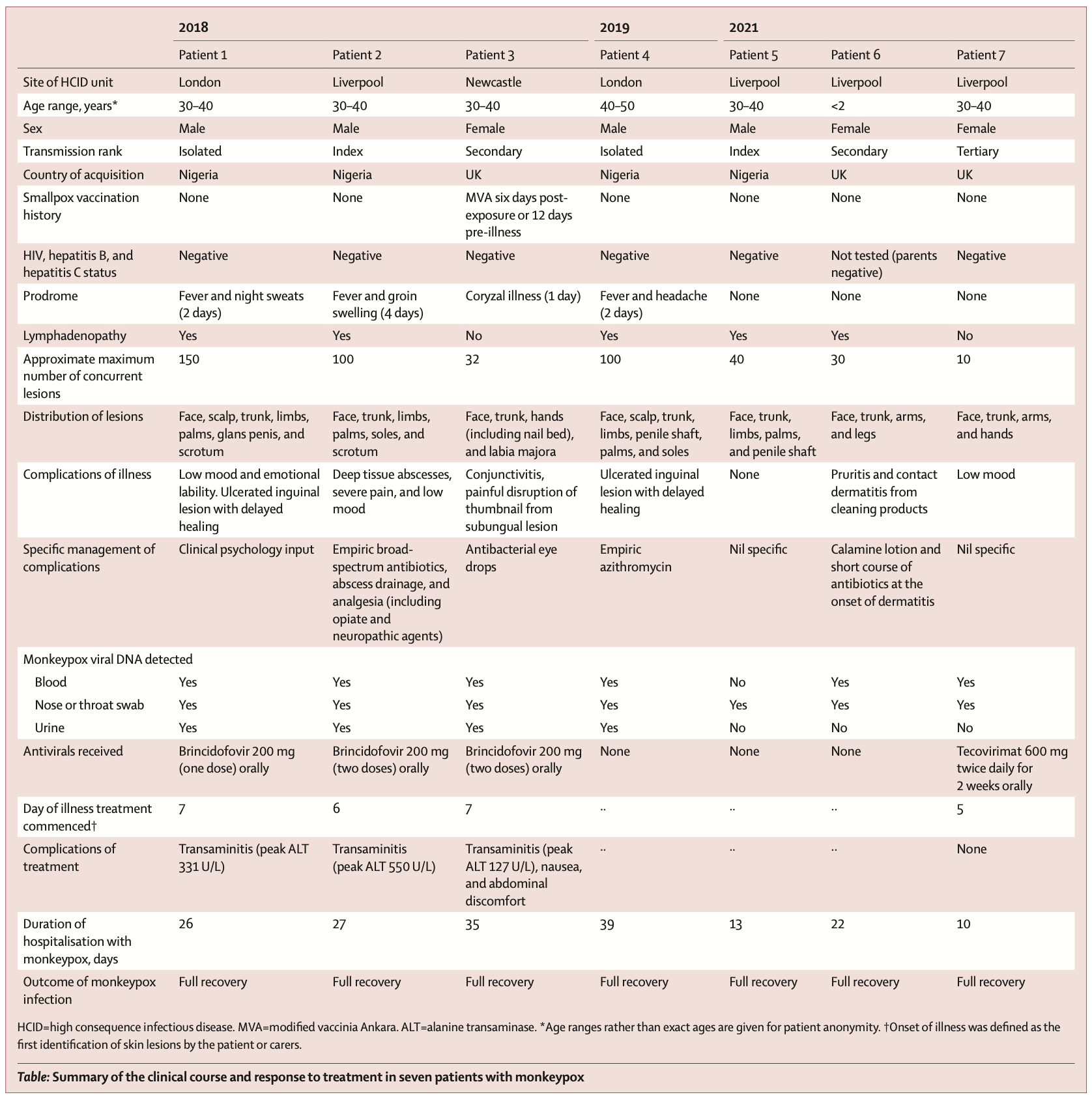 研究者用图表报告了7名患者的临床病症表现和治疗过程。这7名患者中,4名患者在英国以外感染猴痘(患者1、2、4和5);3例在英国境内感染(患者3、6、7) 。从时间上来看,2018 - 2019年发生4例,2021年发生3例。