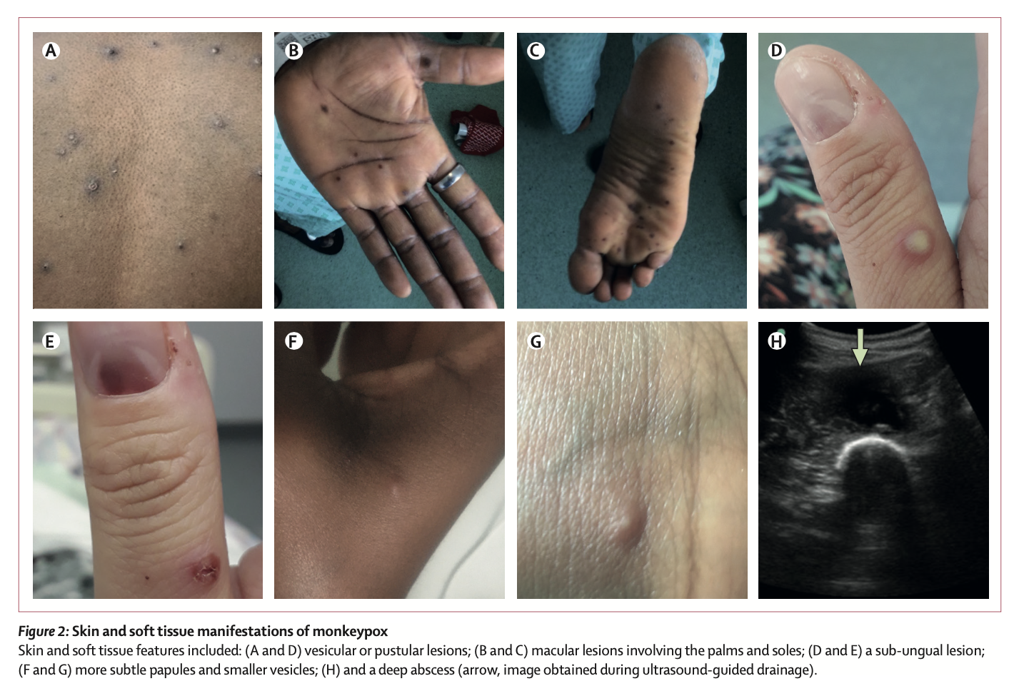 没有患者经历猴痘常见的任何严重并发症,如肺炎或叠加性细菌败血症。患者2(2018)代表了首例深部组织猴痘脓肿的成年患者报告。患者的两个脓肿均未直接与浅表皮肤病变相通,大腿脓肿在确诊后约2周通过超声检查发现,脓肿液中猴痘病毒PCR周期阈值较低。