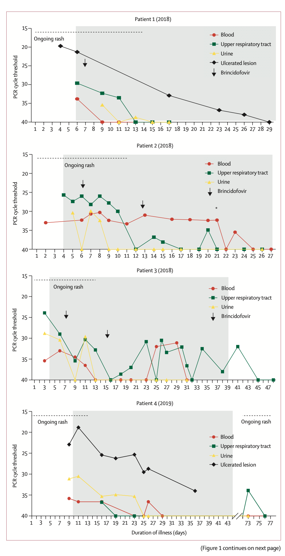 其中,患者的猴痘病毒PCR检测在英国罕见和输入性病原体实验室(UK Rare and Imported Pathogens Laboratory)完成。检测样本包括EDTA(乙二胺四乙酸)血液样本、尿液样本、持续性病变或病变液拭子和上呼吸道拭子,检测通常每48-72小时进行一次,直到每个解剖部位(即皮肤、血液或呼吸道)连续记录两次阴性结果。这些阴性结果,加上所有可见病变脱皮,无新病变,无活性黏膜病变,构成了HCID中心同意将患者送至社区隔离的标准框架。