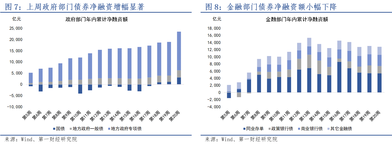 上周,债券市场净融资额走势分化,政府部门债券净融资额显著上升,金融部门与非金融企业部门债券净融资额下降。