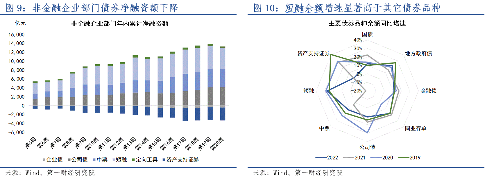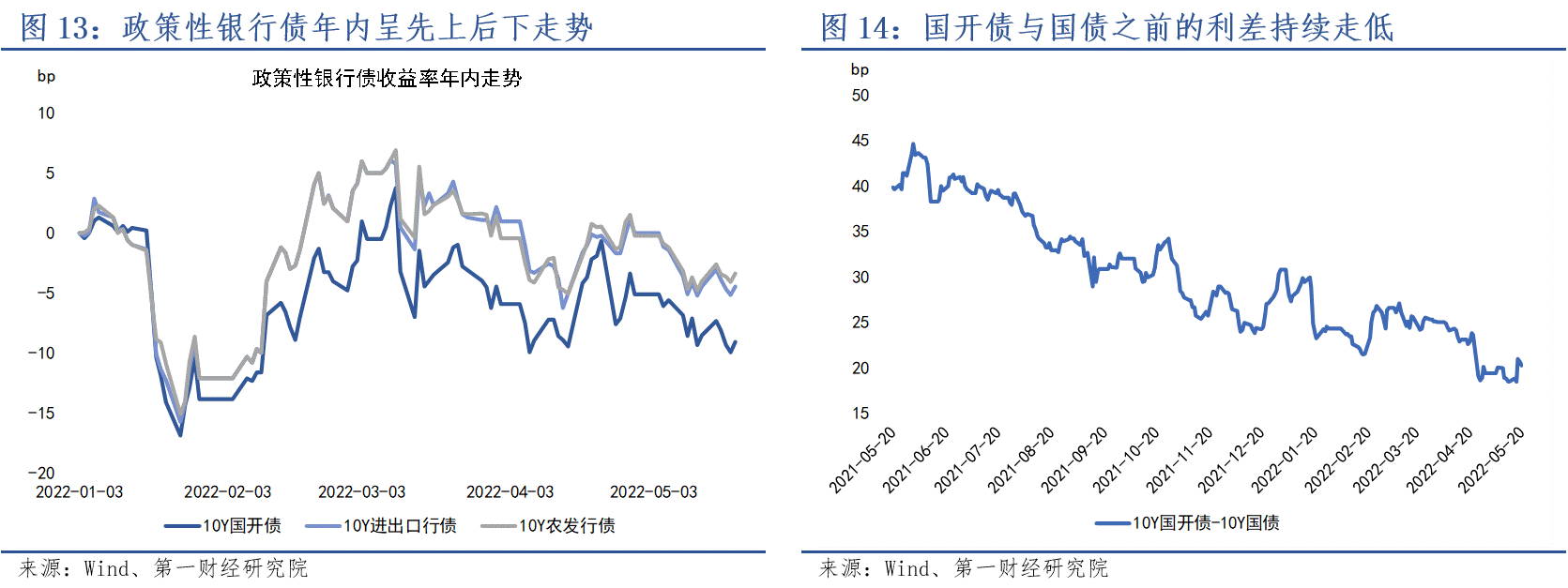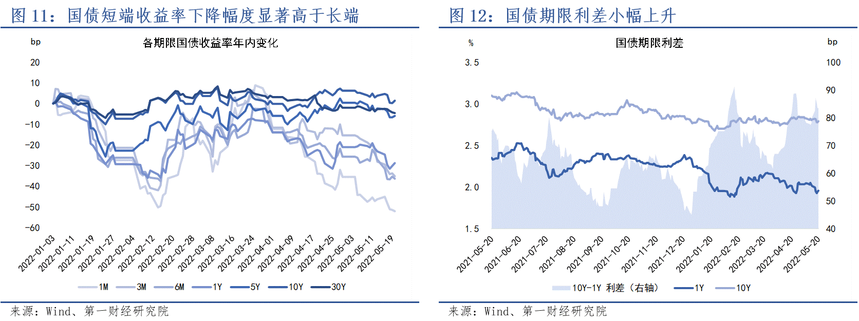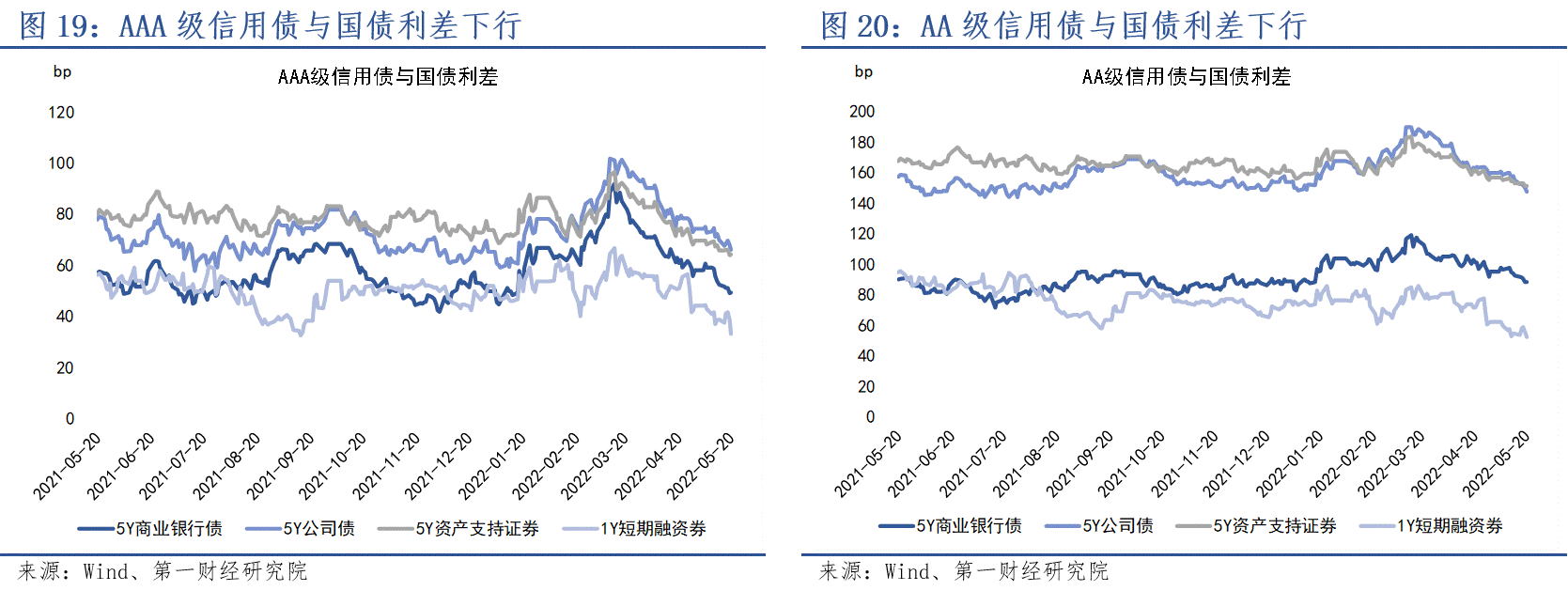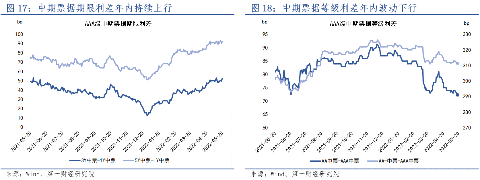 从中期票据的期限利差来看,截至5月20日,3年期与1年期中票收益率差以及5年期与1年期中票收益率差周内分别上升4.33bp和2.34bp至52.37bp和91.84bp,年内两者分别上升29.66bp和33.79bp。