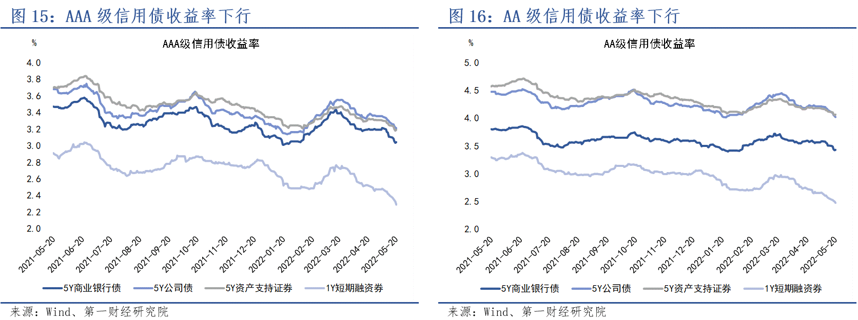 上周,信用债收益率周内下行幅度显著。具体来看,在AAA级债券中,5年期商业银行债、公司债、资产支持证券收益率在周内分别下降6.60bp、7.41bp和5.09bp,1年期短期融资券收益率周内下降11.16bp;在AA级债券中,5年期商业银行债、公司债和资产支持证券收益率在周内分别下降7.60bp、11.38bp和5.01bp,1年期短期融资券收益率周内下降8.16bp。