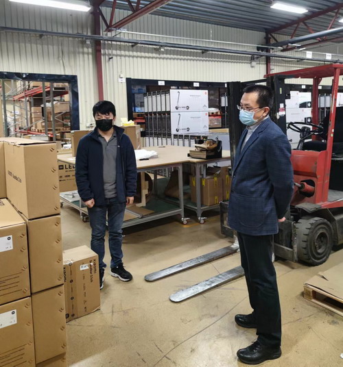 顾总领事参观了华商企业NORD365集团位于哈姆斯塔德市的物流中心,听取了企业经营、发展情况报告。顾总领事对企业团结侨胞、创造就业、贡献当地社会等给予充分肯定,对企业经营中遇到的困难高度重视,表示总领馆积极支持企业向当地主管部门表达合理诉求,全力维护我海外公民合法权益。