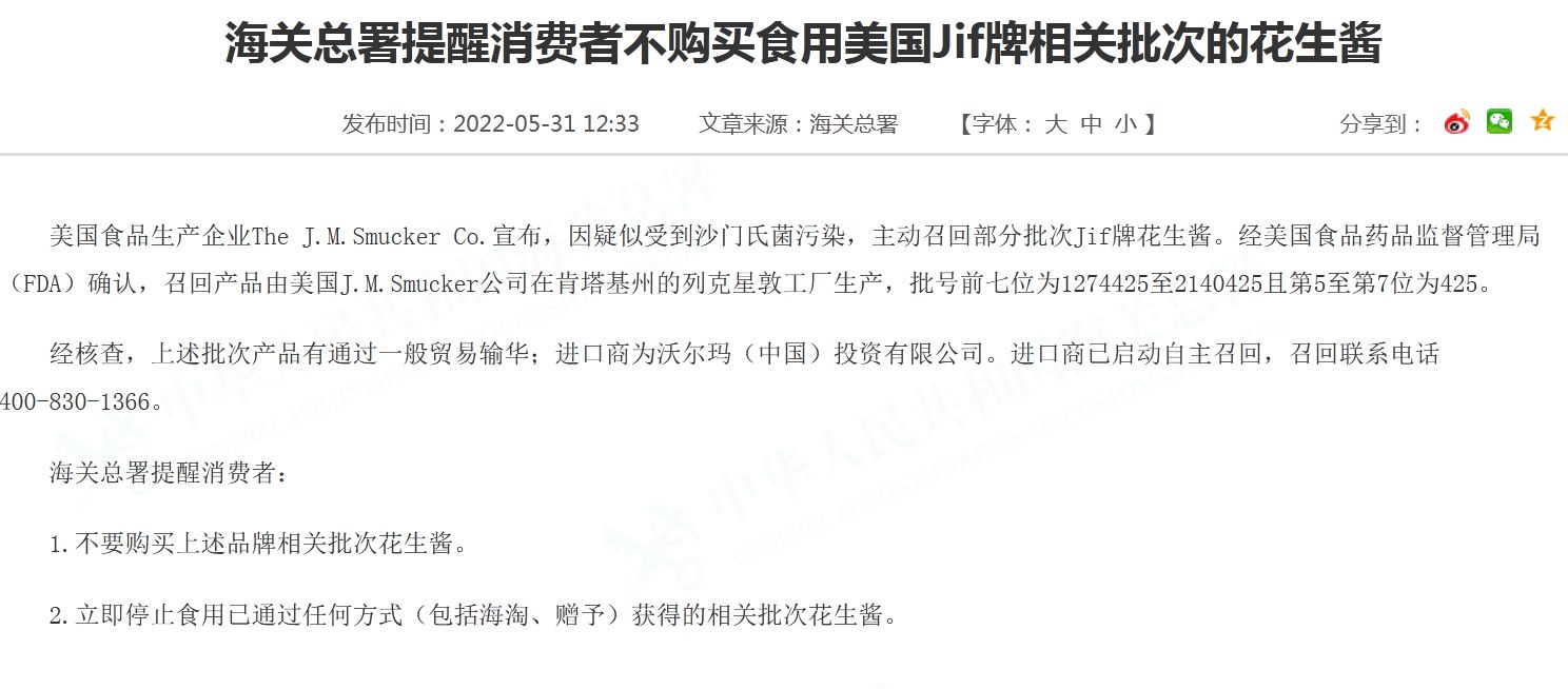 海关总署称,美国食品生产企业The J.M.Smucker Co.宣布,因疑似受到沙门氏菌污染,主动召回部分批次Jif牌花生酱。经美国食品药品监督管理局(FDA)确认,召回产品由美国J.M.Smucker公司在肯塔基州的列克星敦工厂生产,批号前七位为1274425至2140425且第5至第7位为425。