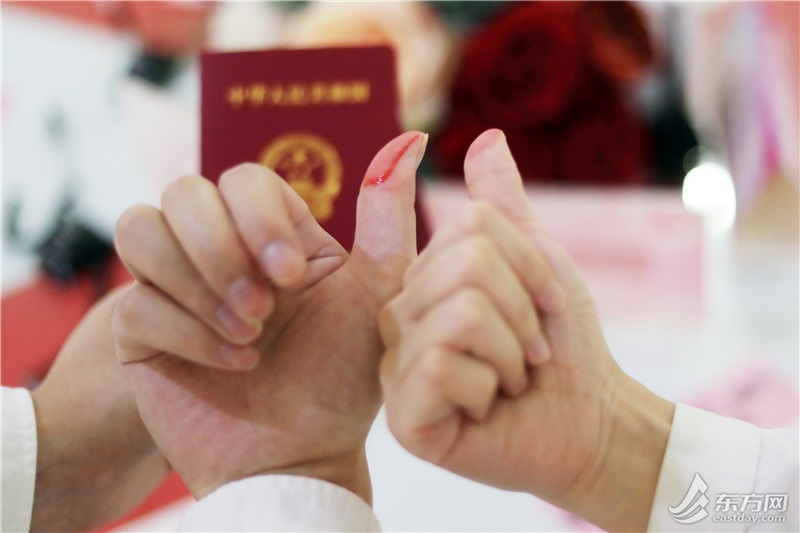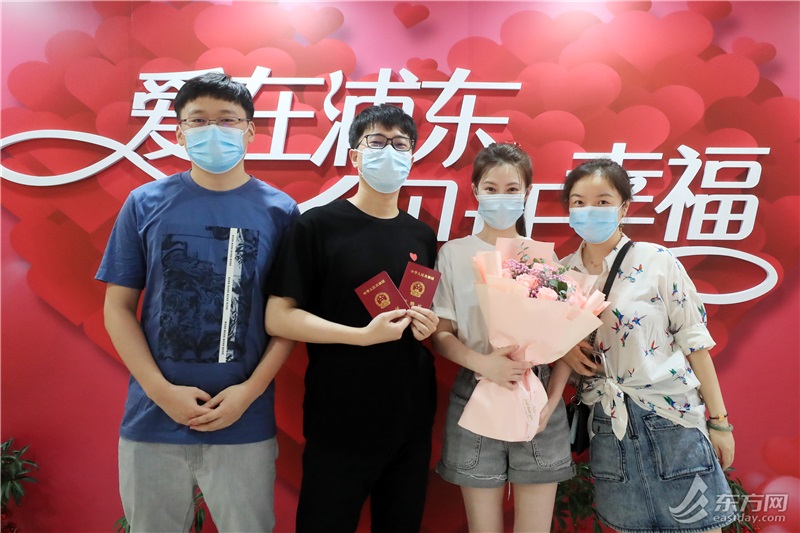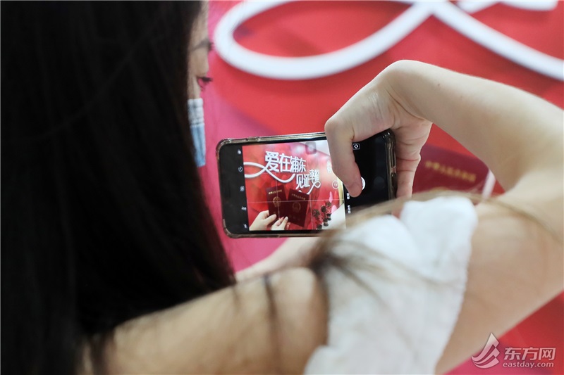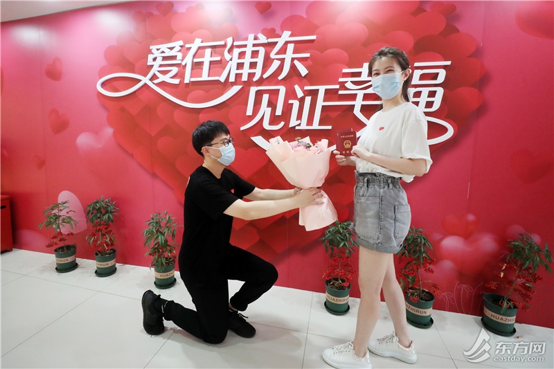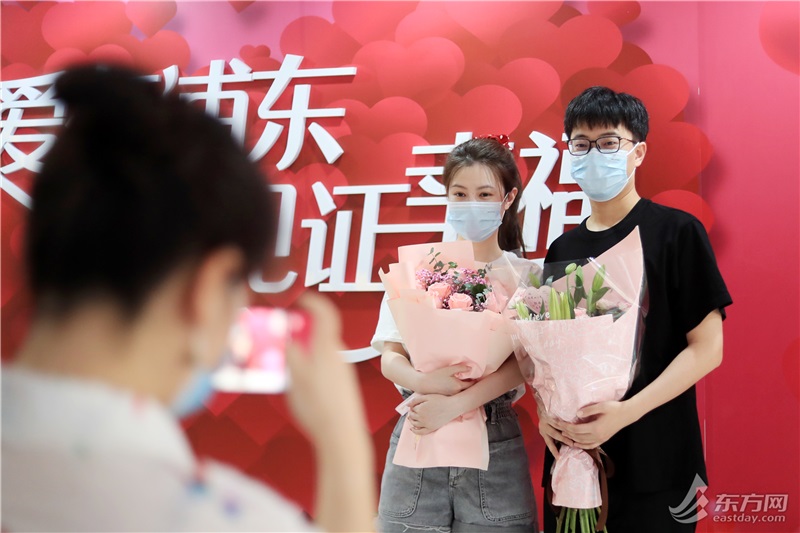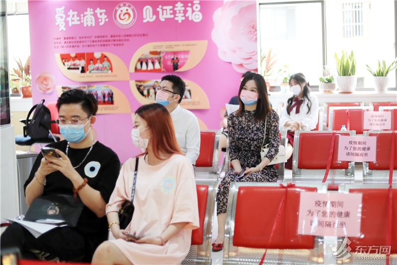 在这样一个富有纪念意义的日子,为了给新人留下美好的回忆,浦东婚管所也做足了准备。通过提早开门、延长服务、分批引导等方式,避免人群聚集,严格实行“两米安全距离”,同时,利用“数字哨兵”,降低感染风险,筑起婚登场所安全防线。办理过程做到“一笔伴全程”,间隔而座,即办即走,不扎堆、不聚集、不逗留。