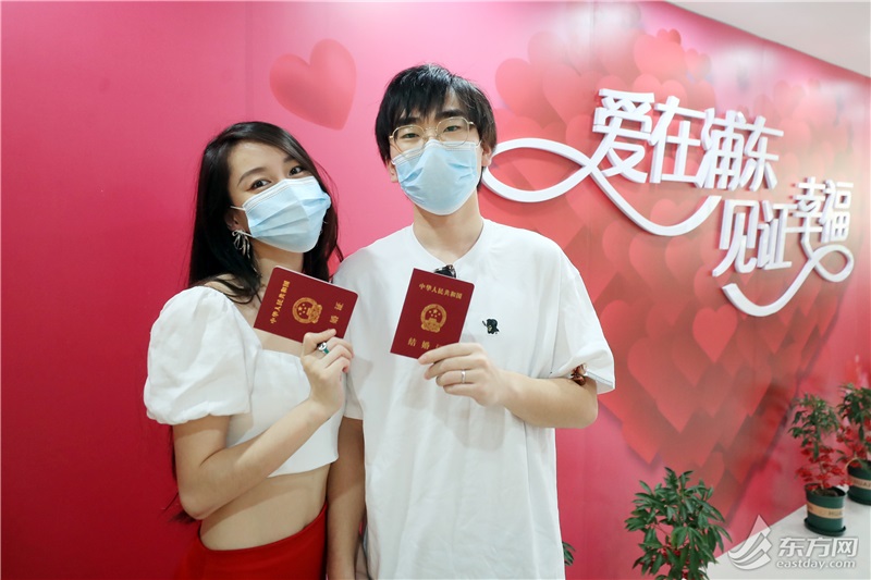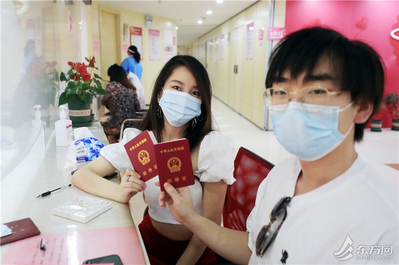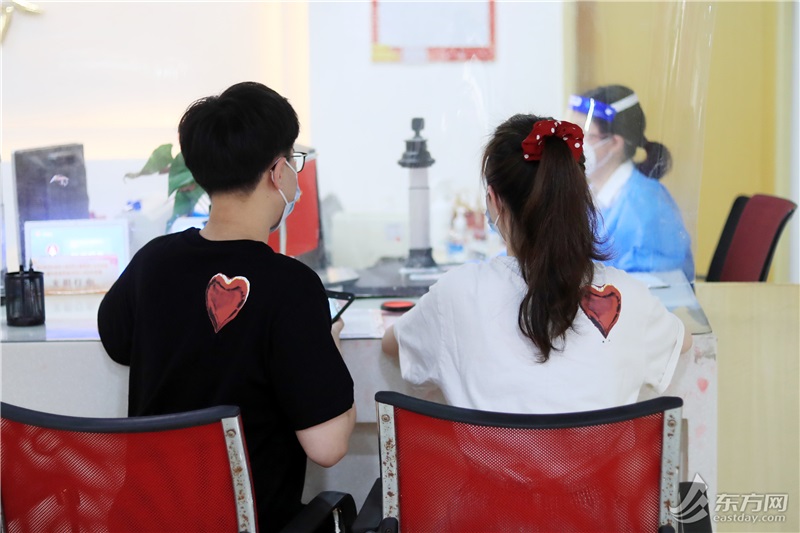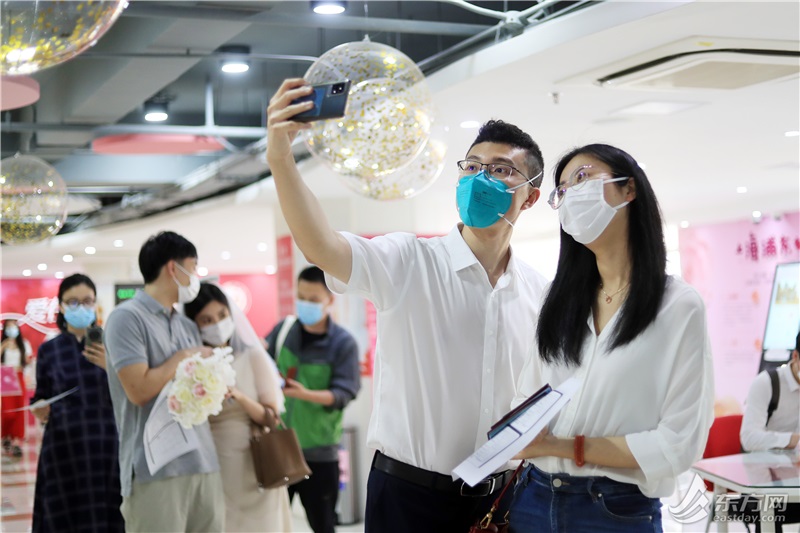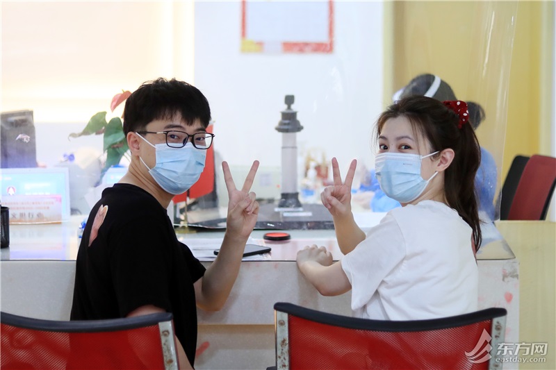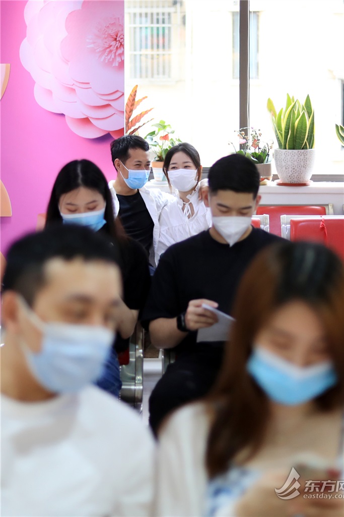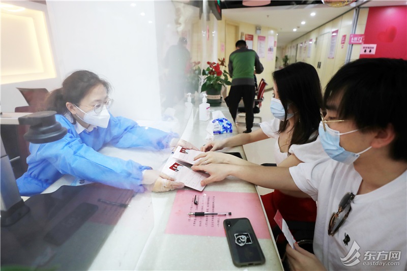 “我们本来想5月20日领证的,昨天得知上海要恢复正常生活秩序之后,立刻预约了6月1日来登记结婚。”王小姐和未婚夫穿着素净的白衬衫,口罩也遮挡不住她的笑意。