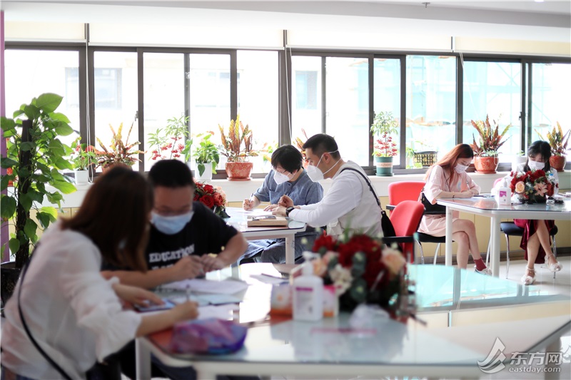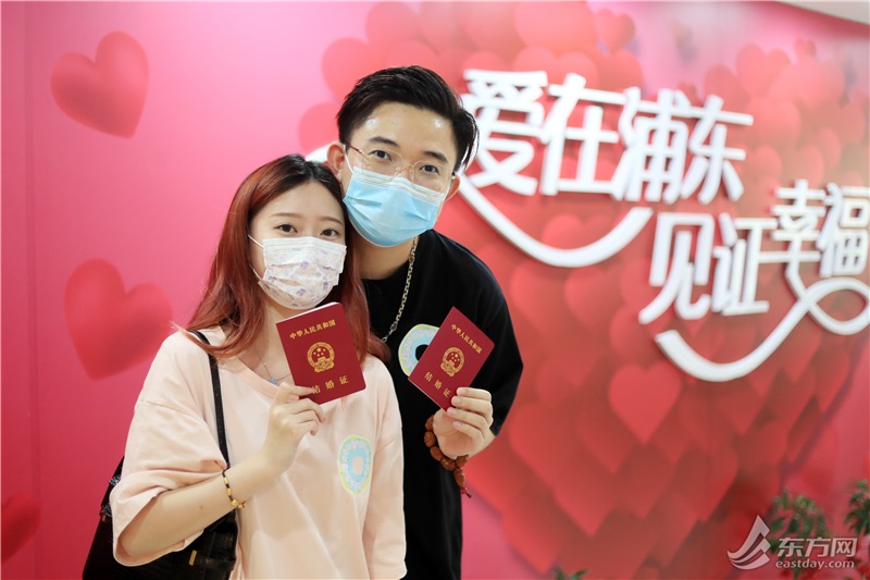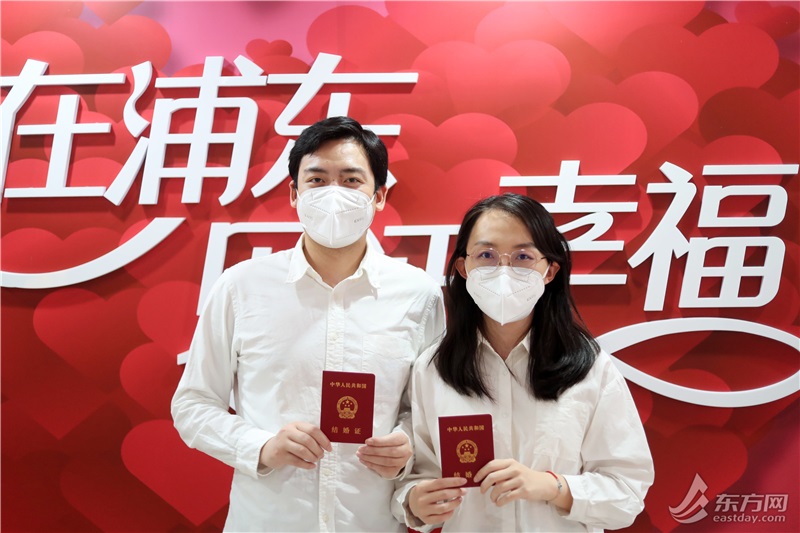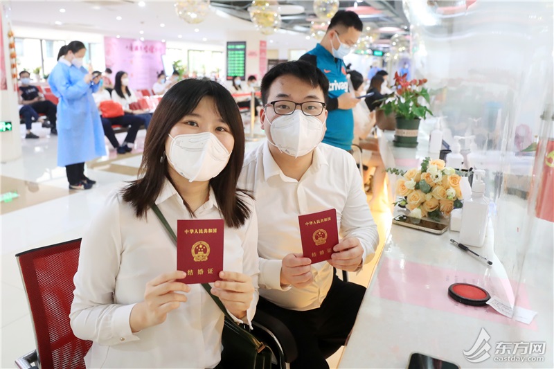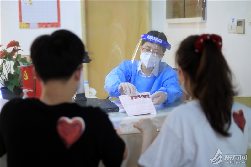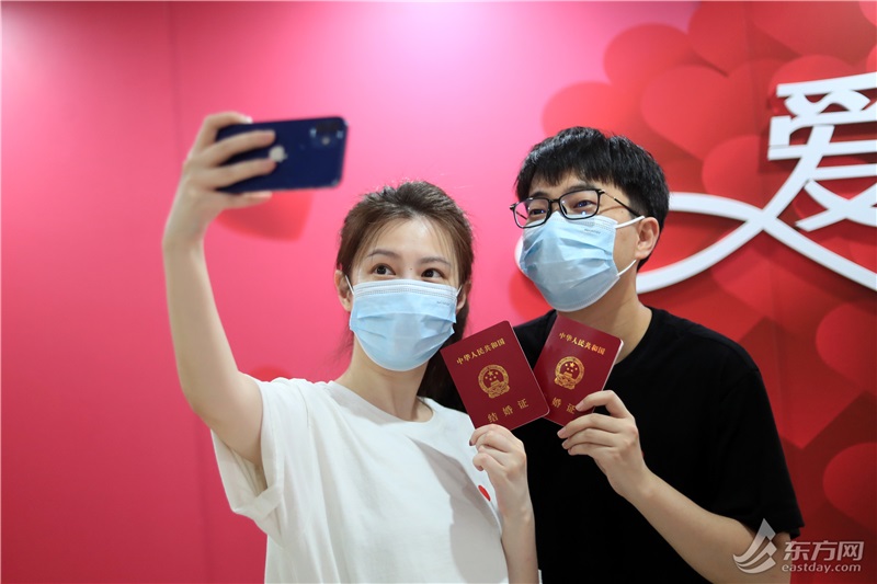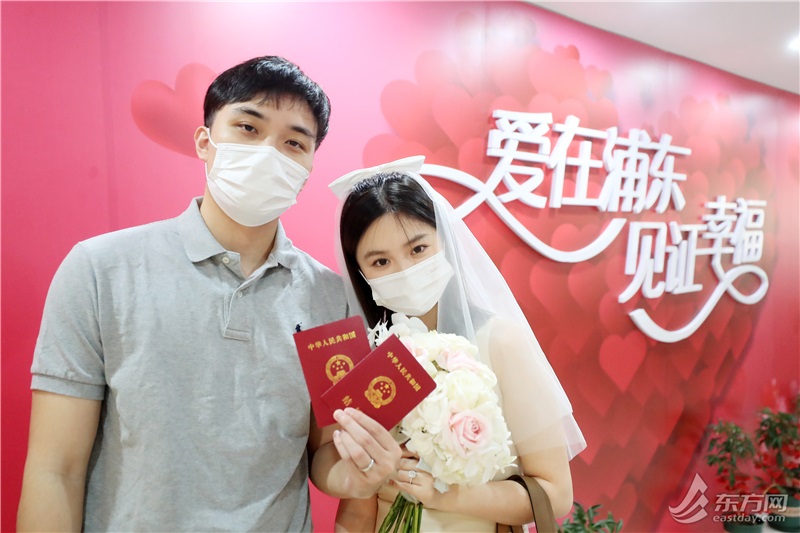 “我们本来想5月20日领证的,昨天得知上海要恢复正常生活秩序之后,立刻预约了6月1日来登记结婚。”王小姐和未婚夫穿着素净的白衬衫,口罩也遮挡不住她的笑意。