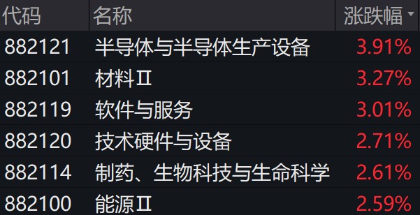 Wind数据显示,申万一级行业分类下,电力设备、计算机、电子、医药生物等板块均涨幅居前,分别上涨4.59%、3.34%、2.66%、2.45%。