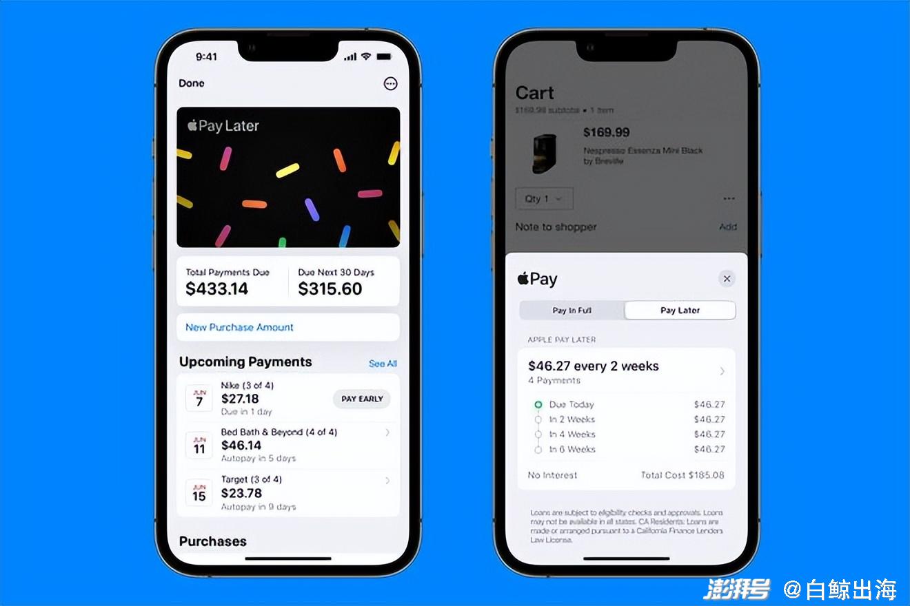 先说一下苹果新推出的先买后付功能 Apple Pay Later。根据 The Verge 的报道,Apple Pay Later 将会面向美国的 iPhone 和 Mac 用户推出,用户可以通过 Apple Pay Later 在六周之内免息分期 4 期购物。这项服务将基于 Apple Pay 支付,在使用 Apple Pay 付款时,除了“全额付款”选项之外,还会增加一个“后付”的选项,用户可以在任何线上和线下支持 Apple Pay 的商店使用 Apple Pay Later。