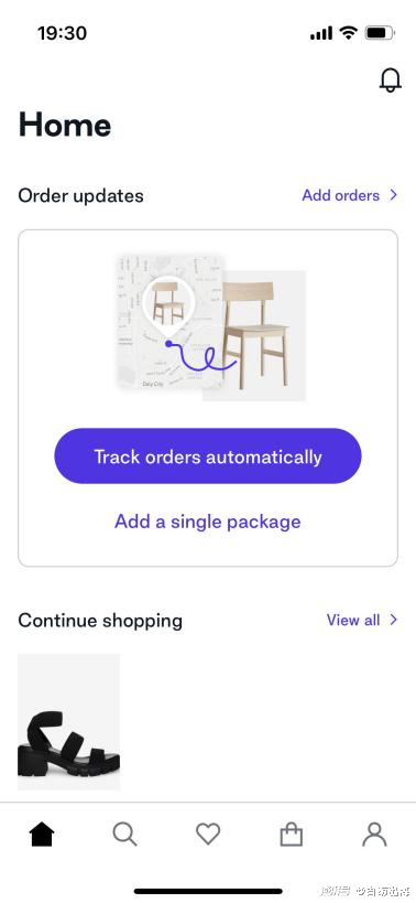这次苹果选中的“合作伙伴”Shopify 在 2017 年的时候推出了自己的 ToC 产品 Shop,这款 App 面向消费者提供多项与线上购物相关的功能,比如好物推荐、添加心愿单、结账购买等,其中最重要的其实是物流追踪功能。从 Shop 的 App 设计来看,物流追踪功能被放在了底部第一个一级标签中,最顶部的位置。