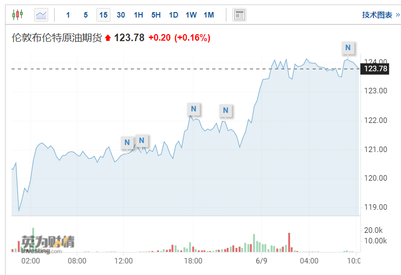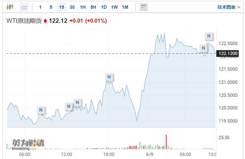 近期油价持续上行,国际油价已突破122美元。截至发稿,布伦特原油期货涨0.16%,报123.78美元/桶。WTI原油期货涨0.01%,报122.12美元/桶。