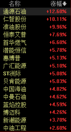 6月9日早盘,油气板块领涨两市。截至发稿,仁智股份、准油股份涨停,通源石油涨12.6%,恒泰艾普、首华燃气、中国海油等多股涨超4%。
